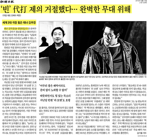16일자 <조선일보>에는 세계 3대 극장을 휩쓴 테너인 김우경 성악과 교수의 인터뷰가 전해졌습니다. 2003년 독일 드레스덴 국립 오페라 극장 전속 가수로 들어가면서 주역으로 무대에 선 김 교수는 지금까지 세계 3대 극장을 모두 휩쓸며 활발하게 활동하고 있는데요. 완벽한 무대를 위해 빈 국립오페라 극장의 제의도 거절할 만큼 준비성이 철저하다고 알려져 있다고 합니다. 한양대에서는 늘 밤늦게 퇴근하는 교수로 소문이 난 그는 "평소에도 연 45~50회정도밖에 오페라를 하지 않는데요. 학교에 오니 절반 이하로 횟수가 줄었습니다. 학생들 가르치면서 연주자로 사는 게 쉽지 않네요"라고 말했습니다.