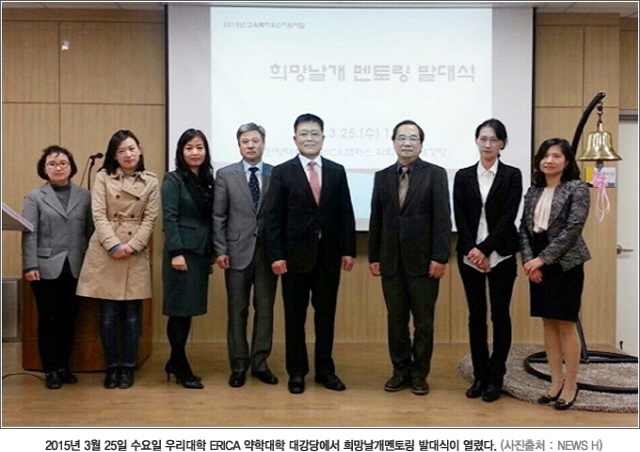지난달 25일, 우리대학 ERICA캠퍼스 약학대학 대강당에서 희망날개멘토링 발대식이 열렸다. 희망날개멘토링은 안산지역에 있는 저소득층 초등학생 및 중학생을 대상으로 매 학기 학습과 독서, 정서지원을 위해 우리대학 학생들과 멘토-멘티의 관계를 맺어주는 프로그램이다. 지역사회 교육공동체 실현을 위해 시작된 이 프로그램은 안산교육지원청과 ERICA 캠퍼스의 업무 협약을 통해 2013년에 처음 시작돼 올해로 3년째를 맞이했다. 이번 모집에는 독서멘토링 20명, 정서멘토링 14명으로, 다양한 전공을 가진 ERICA 캠퍼스 재학생 34명과 안산교육지원청에서 선정한 초·중학생 총 70명이 참가했다.