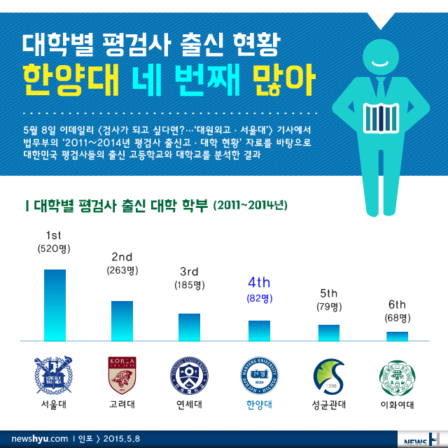 지난 5월 8일 이데일리 <검사가 되고 싶다면?…‘대원외고·서울대’> 기사에서는 법무부의 ‘2011~2014년 평검사 출신고·대학 현황’ 자료를 바탕으로 대한민국 평검사들의 출신 고등학교와 대학교를 분석했다. 본 기사에 따르면 대학별 평검사 출신 현황을 살펴볼 때 한양대가 네 번째 많은 것으로 나타났다.