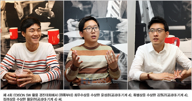 눈부신 속도로 발전하는 과학기술은 우리 삶에 많은 혜택을 주고 있다. 하지만 그만큼 과학기술에 대해 이해하기 어려워지고 있는 것도 사실이다. 미래창조과학부는 학생들이 조금 더 쉽게 과학기술에 접근할 수 있도록 다양한 EDISON 교육용 소프트웨어를 개발하고 있다. 또한, 이러한 교육용 소프트웨어의 다양한 활용 방안과 창의적인 사고를 촉진하기 위해 미래창조과학부는 매년 에디슨 소프트웨어(이하 EDISON SW) 활용 경진대회를 개최하고 있다. 제 4회 EDISON SW 활용 경진토토사이트 실수에서 최우수상을 수상한 윤성준(공과대·기계 4), 특별상을 수상한 김원곤(공과대·기계 4), 장려상을 수상한 황윤찬(공과대·기계 4) 씨를 만나 이야기를 들어봤다.
