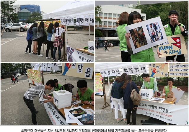 희망한대 대원들은 지난 6일부터 8일까지 우리대학 한마당에서 네팔 지진피해를 돕는 모금운동을 진행했다. 희망한대는 우리대학 사회봉사단에서 운영하는 학생봉사단으로 현재 36명의 학생이 희망한대 2기로 활동하고 있다. 이번 모금운동에는 대원 전원이 공강시간과 자투리시간을 모아 모금운동에 참여했다. 모금운동과 함께 포스트잇을 통해 네팔에 응원메시지를 전달하는 ‘사랑의 나무’도 함께 진행했다. 정해준(공과대·기계 4) 씨는 “학생들의 많은 참여로 인해 나무의 형태를 찾을 수 없을 만큼 많은 메모지가 붙었다”며 참여한 이들에게 감사의 말을 전했다.