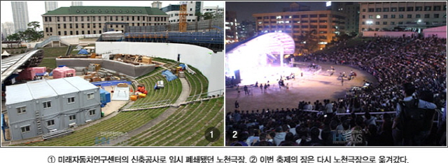정몽구미래자동차연구센터의 공사가 시작되며 변한 것이 몇 가지 있었다. 교내에서 흔치 않았던 공터가 사라졌다. 공사를 위해 높은 철제 펜스가 세워졌다. 그리고, ‘노천’이라 불리는 노천극장이 폐쇄됐다. 학생들은 낭만을 위한 공간이 사라졌음을 아쉬워했다. 교내에 그나마 남아있던 녹지가 사라지며 학교가 한층 더 삭막해졌다는 얘기도 했다. 언젠가 돌아올 것이라고 믿었지만 그 언젠가가 멀게만 느껴졌다. 그러나 나른한 봄을 거쳐 뙤약볕이 내리쬐는 여름을 보내고, 대운동장에서 축제를 열며 가을을 지낸 후 추운 겨울을 웅크려 지내자, 다시 봄과 함께 노천극장이 돌아왔다. 11개월 만에.