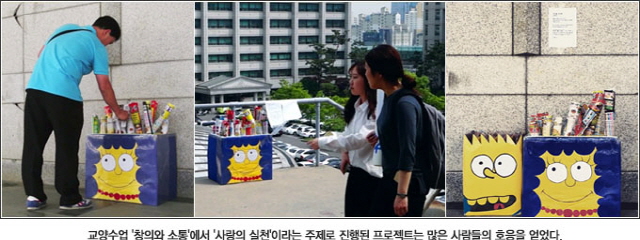 학생들이 학교에 대한 고민을 나누는 ‘한양대학교 대나무숲’ 페이지에 한 장의 사진이 올라왔다. 미국 만화 ‘심슨’(Simpson) 속 캐릭터 ‘마지 심슨’과 '바트 심슨'의 얼굴이 붙은 상자에 돌돌 말린 전단지들이 꽂혀있는 사진이었다. 이는 장동진(공과대·에너지 3) 씨를 비롯한 9명의 학생들이 교양 수업 ‘창의와 소통’의 과제를 위해 설치한 것이었다. “‘사랑의 실천’이라는 주제로 프로젝트를 진행하고 10분 동안 발표하는 과제였습니다. 과제를 위해 조원들이 낸 아이디어 중 노천극장을 깨끗하게 해보자는 생각이 있었어요. 날씨가 좋아지면서 많은 학생들이 먹을 것을 시키고 그릇을 방치하고, 전단지가 여기저기 뿌려져 있어서 보기가 안 좋다는 말을 많이 접하면서 문제를 해결해보자고 결정했습니다.”