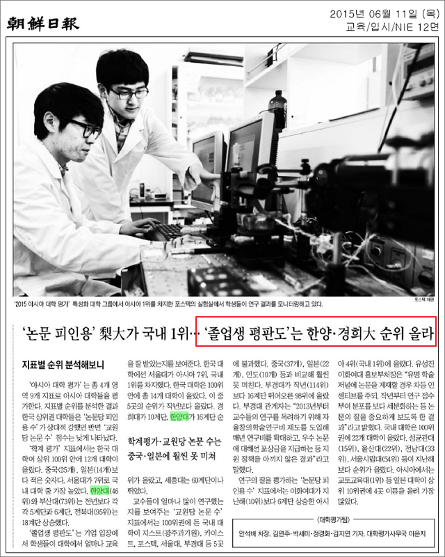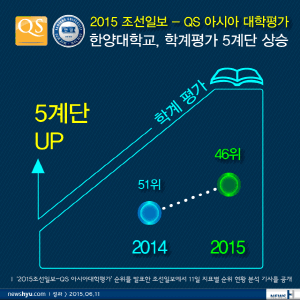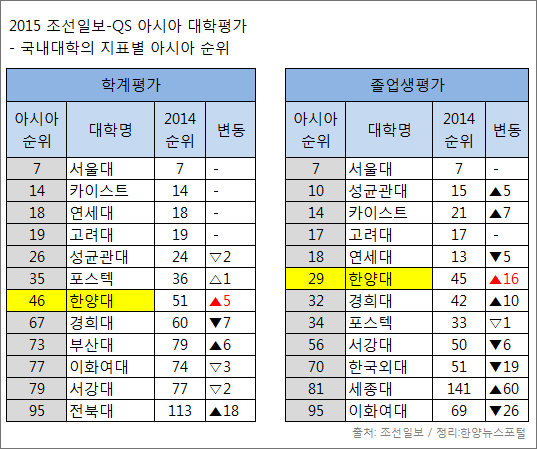 전날 ‘2015조선일보-QS 아시아대학평가’ 순위를 발표한 조선일보에서 11일 지표별 순위 현황 분석 기사를 공개했다. 총 4개영역 9개 지표를 통해 점수를 부여한 이번 평가에서 한양대는 학계평가와 졸업생평가에서 크게 상승한 것으로 확인 됐다.