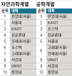 | ▲ 2016 이공계대학평가 계열별 순위 (출처 : 한국경제) | ||