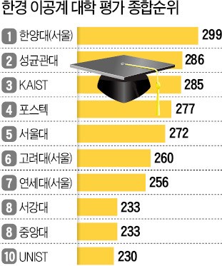 ‘한양대, 국내 최고 이공계 대학’이라는 제목으로 게재된 한국경제 8일자 기사에 따르면, 한양대는 종합점수 299점을 받으면서 286점을 받은 성균관대와 큰 점수 차를 보이며 1위에 올랐다. 그 뒤를 이어 KAIST, 포스텍, 서울대, 고려대, 연세대, 서강대, 중앙대, UNIST가 10위내 목록에 들어왔다. 기사는 한양대가 적극적인 창업과 취업을 지원하고 산학협력을 통해 연구성과를 실용화하는 학풍이 높은 점수를 받았다고 전했다. 한양대는 전국 이공계대학 취업률(79.4%)을 비롯해 누적기술이전수입(228억원), 창업강좌 이수 학생 비율(100%), 전임교원 비율(100%), 창업전담 인력(30명) 부문에서 1위를 하는 등 정량적인 지표에서도 강했다. 한양대는 종합 평가 이외에도 자연과학계열과 공학계열로 나눠지는 계열별 순위에서도 각각 1위를 했다.