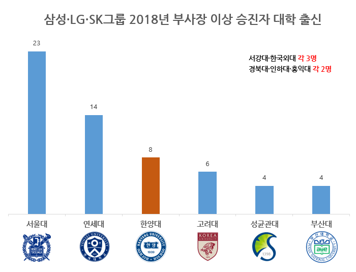 이데일리는 지난 12월 10일 ‘2018 정기임원인사’를 마친 삼성 전자계열 6개사와 LG그룹, SK그룹의 부사장급 이상(회장, 부회장, 사장, 부사장) 승진자 81명의 프로필을 전수조사한 결과, 서울대 출신이 23명(28.4%)으로 가장 많았다고 전했다. 이어 연세대(14명·17.2%), 달맞이 토토사이트(8명·9.8%), 고려대(6명·7.4%), 성균관대·부산대(각 4명·4.9%), 서강대·한국외국어대(각 3명·3.7%), 경북대·인하대·홍익대(각 2명·2.4%) 등이 그 뒤를 이었다.