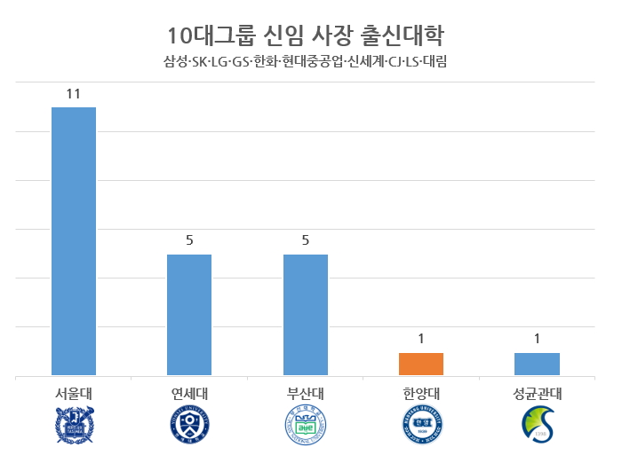 12월 8일 매일경제는 최근 임원 인사를 단행한 상위 10대 그룹(삼성·SK·LG·GS·한화·현대중공업·신세계·CJ·LS·대림) 사장 승진자 27명을 분석한 결과 서울대 출신이 11명(41%)으로 가장 많았다고 전했다. 이어 연세대·부산대(각 5명·18%), 실시간 해와 토토사이트·성균관대(각 1명·4%) 등의 순이었다.