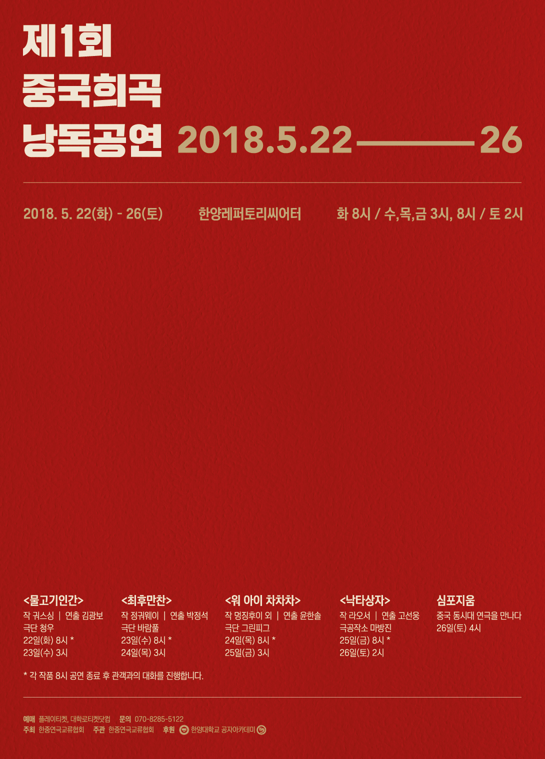 22일 오수경 교수에 따르면, 이번 공연에는 중국 연극계에서 화제를 모은 ‘물고기인간(궈스싱 작, 김광보 연출)', ‘최후만찬(정궈웨이 작, 박정석 연출)’, ‘워 아이 차차차(멍징후이 작, 윤한솔 연출)', ‘낙타상자(라오서 작, 고선웅 연출)’ 등 네 작품이 무대에 오른다.