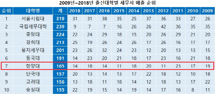 이번에 공개된 최근 10년간 대학별 세무사 합격 인원은 수험생들이 시험을 치를 당시 직접 입력한 정보를 기준으로 한 것이다. 한양대는 연평균 16명 이상의 세무사를 배출했다. 대학들의 세무사 배출 현황이 공개된 것은 이번이 처음이다.
