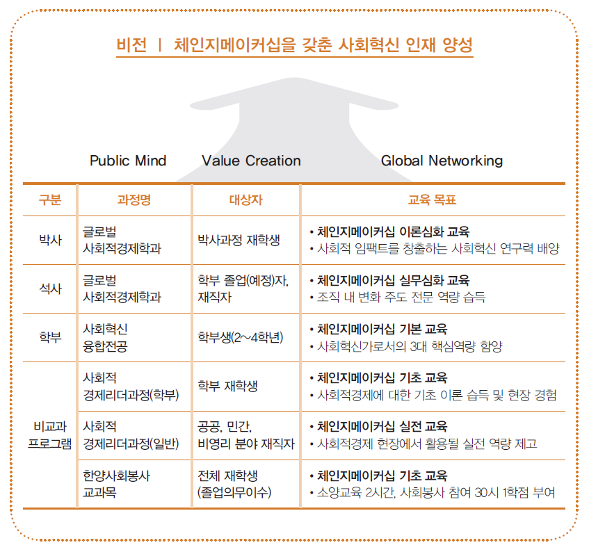 연간 3000여 명이 참여하는 사회봉사교과목을 바탕으로 2018년 3월 오픈한 사회혁신융합전공(학부), 글로벌사회적경제학과(석사과정), 2019년 2학기 신설될 글로벌사회적경제학과의 박사과정이 연결돼 공동체에 대한 책임감(Public Mind), 창의적 가치창출역량(Value Creation), 실천을 위한 자원연계역량(Global Networking)의 ‘체인지메이커십’을 갖춘 인재를 육성하게 된다