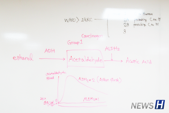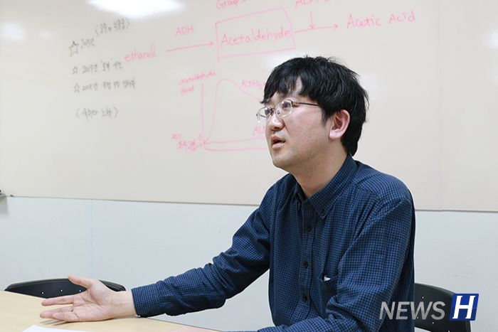 강 교수는 지난 2013년 숙취 해소 제품을 개발하는 친구의 권유로 알코올에 대한 연구를 시작했다. 그는 스탠퍼드대학교 Che-Hong Chen 교수의 <targeting aldehyde dehydrogenase 2 : new therapeutic opportunities> 논문을 한 달 동안 정독하면서 알데히드의 위험성을 깨달았다. 강 교수는 "한국인의 30%는 알데히드를 분해하는 효소인 ALDH2가 약하기 때문에 한 잔의 술도 치명적일 수 있다"고 밝혔다.