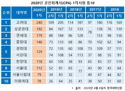 합격자들 가운데 재학생이 64.5%로 가장 많았으며, 대학 졸업자는 25%를 차지했다. CPA 1차 합격자 10명 중 9명이 대학 문턱을 밟은 셈이다. 대학 내 전공 중에서는 상경계열 인원이 압도적으로 많았다. 이는 경영학, 경제원론, 상법, 회계학 등 시험 과목 구조상 상경계열 출신들이 강점을 갖기 때문이다. 무려 77.8%의 합격자가 상경계열 출신인 것으로 조사됐다.