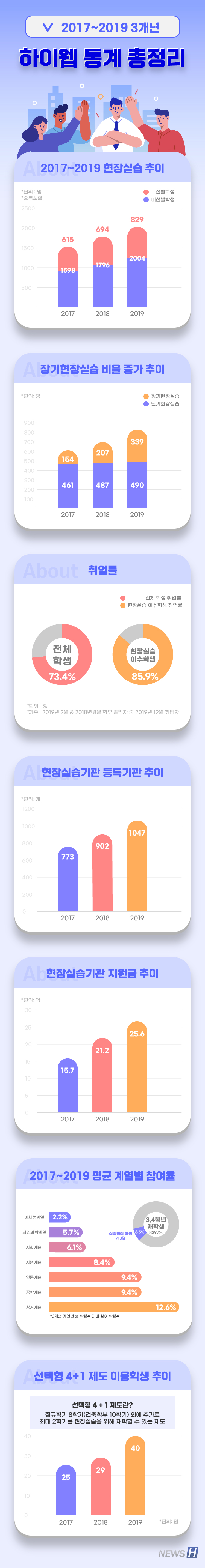하이웹은 서울캠퍼스의 학교에서 직접 실습기관과 실습생을 모집 및 연계하여 진행하는 현장실습(인턴십) 프로그램이다. 체계적인 취업지원 프로그램 도입을 통한 우수 인력 배출, 취업지원 프로그램 참여를 통한 취업스및 자신감 회복, 직킬 무역량 교육 및 현장실습 강화를 통한 직군별 인재 양성 등에 대한 현장 중심 교육 실시를 목적으로 하고 있다. 지난 2017년부터 2019년까지 3개년 하이웹 실습 통계를 정리했다.