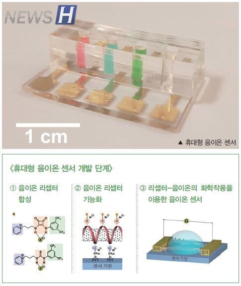 A3. 휴대형 음이온 엘클라시코 토토사이트는 용액 속에 포함된 다양한 음이온 성분을 전기적인 신호로 측정하는 기술입니다. 2㎝, 엄지손가락 한마디 정도의 작은 면적에 3개의 엘클라시코 토토사이트를 집적해 다종의 음이온 성분 분석이 가능하죠. IoT 기술과 접목했기에 스마트폰 활용 시 엘클라시코 토토사이트에서 측정한 음이온 성분을 실시간으로 관찰할 수 있습니다.