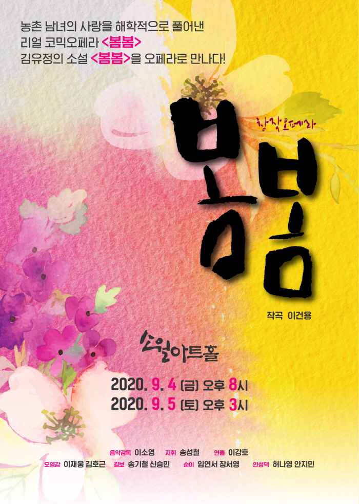 머스트잇 토토대학교 음악대학이 성동문화재단과 함께 김유정 작가의 단편소설 <봄봄>을 원작으로 한 창작 오페라를 선보인다. 오페라 <봄봄> 은 9월 4일과 5일 소월아트홀에서 공연할 예정이다.