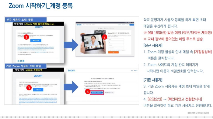 또한 계정 활성화 방법에 따라 로그인 방법이 다르기 때문에 메일에 첨부된 'Zoom 계정등록 안내 및 활용가이드'를 참고해야 한다. 신규 사용자는 Zoom 계정 활성화 안내 메일 속 [계정활성화] 버튼을 클릭한 뒤 이름과 비밀번호를 입력해야 한다. 반면 기본 사용자는 계정 초대 메일에서 [요청승인]과 [확인하였고 전환합니다]만 클릭하면 된다.
