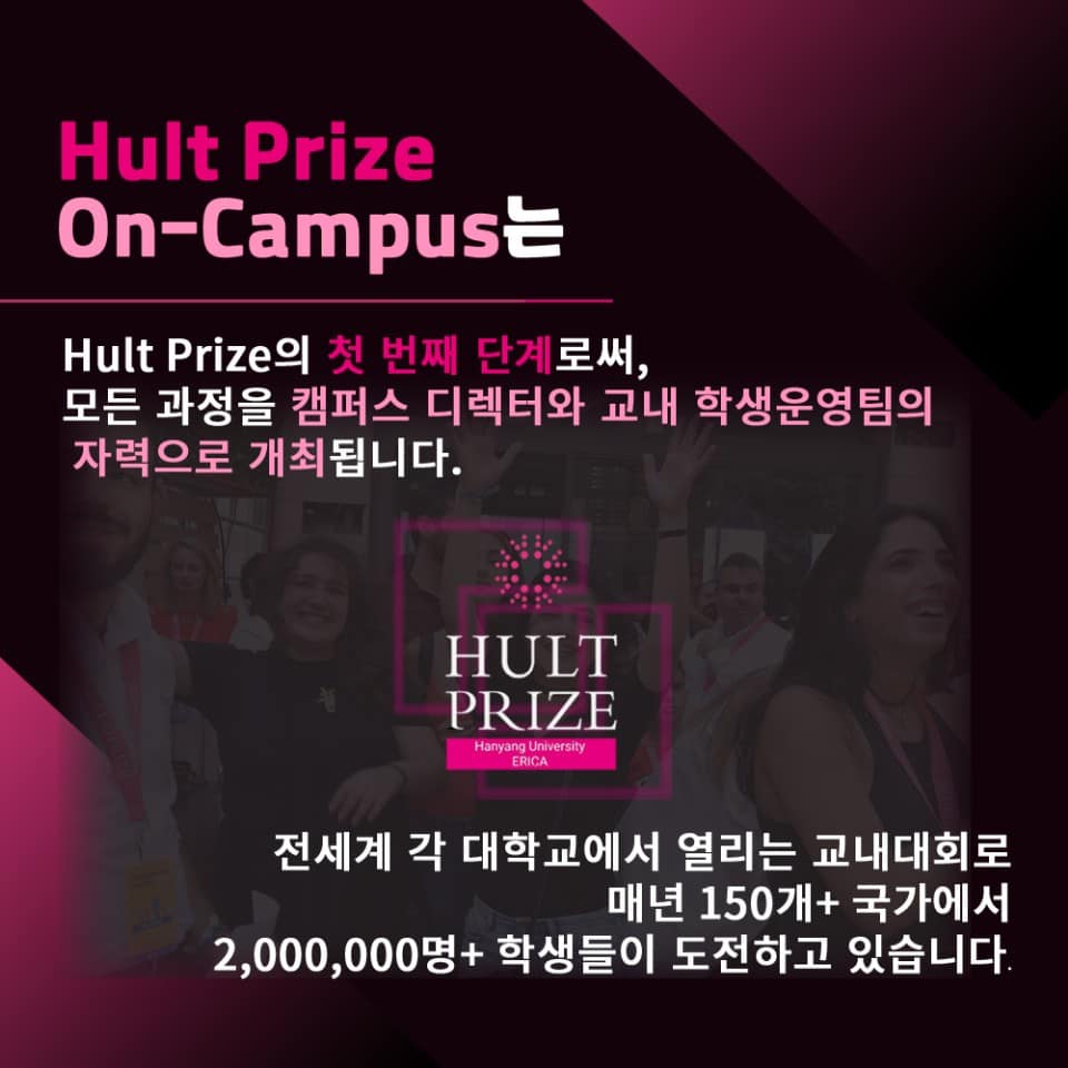 토토사이트 디오스 ERICA캠퍼스에서 '헐트 프라이즈 글로벌 창업 아이디어 경진대회(Hult Prize On-Campus, 이하 온캠퍼스)'가 개최된다. 온캠퍼스는 헐트 프라이즈(Hult Prize)의 첫 번째 단계로써, 모든 과정이 캠퍼스 디렉터와 교내 학생운영팀의 자력으로 진행된다.