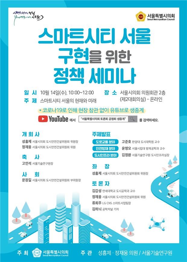 이 날 세미나는 스마트기술의 획기적인 발전과 코로나 등 비대면 활동의 시대적 요구에 대응해 서울시의 스마트시티로의 전환을 위한 분야별 기술동향을 살펴보고 개선과제들을 도출하기 위해 마련됐다. 또한 코로나19로 인해 현장 참관 없이 유튜브로 생중계됐으며, 유튜브에서 ‘서울특별시의회 토론회 공청회 생중계’ 검색시 시청 가능하다.