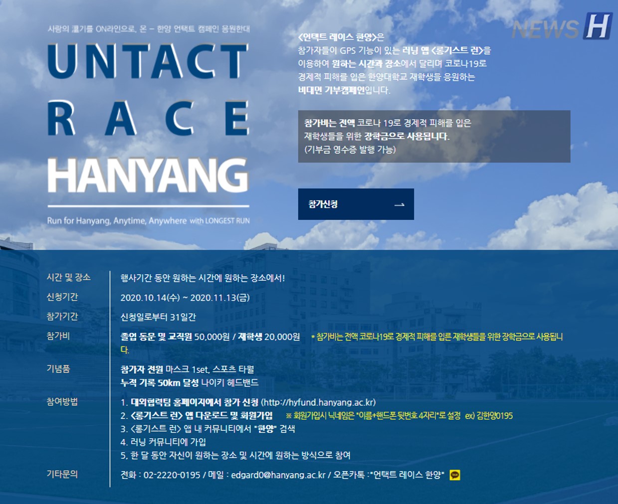 파주 토토사이트대 대외협력팀이 주관하는 '언택트 레이스 파주 토토사이트'은 GPS 기능이 있는 러닝 앱 <롱기스트 런>을 이용하여 참가자들이 원하는 시간과 장소에서 달리며 코로나19로 경제적 피해를 입은 파주 토토사이트대 재학생들을 응원하는 비대면 기부캠페인이다.