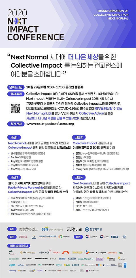 2020 넥스트 임팩트 콘퍼런스는 콜렉티브 임팩트 10주년을 맞이해 그동안 현장에서 활용된 다양한 형태의 콜랙티브 임팩트 사례를 진단한다. 또한 디지털 트랜스포메이션과 코로나19등의 변수로 인해 아무도 예상할 수 없는 넥스트 뉴노멀 시대를 맞아 우리가 어떻게 콜렉티브 액션(Collecitve Action)을 통해 지금보다 더 나은 세상을 만들 수 있을 것인지 논의한다.